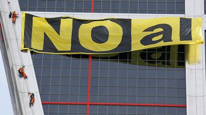 Seis activistas de Greenpeace han escalado la fachada sur de una de las dos Torres Kio para protestar por las negociaciones que llevan a cabo la Unión Europea y Estados Unidos para dar luz verde al Tratado Transatlántico de Libre Comercio e Inversión (TTIP).