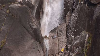 Tercer día de rescate en A Corga da Fecha. El cuerpo del barranquista de 38 años que desapareció el sábado bajo la cascada de este escenario espectacular sigue atrapado tras una piedra, todavía no se sabe a qué profundidad ni en qué postura, a pesar de que ayer, estirando mucho el brazo, un agente del Equipo de Rescate e Intervención de Montaña (EIREM) de la Guardia Civil de Ourense logró tocar una de las manos del cadáver. El hombre, de nacionalidad portuguesa, practicaba este deporte de riesgo con un grupo de amigos. Al descender esta cascada de fuerte caída vertical, en el Fecha, estrecho pero caudaloso afluente del río Caldo (municipio de Lobios, Ourense), dos de los barranquistas fueron empujados por la fuerza de la corriente hacia una brecha entre las rocas. Uno logró salir con ayuda de sus compañeros, pero el otro fue engullido por la grieta y quedó encajado bajo una piedra. El grupo pidió ayuda aquel día pasadas las diez de la noche y el domingo por la tarde la Guardia Civil localizó al fin el cuerpo. Ayer, que no llovía, todos los intentos llevados a cabo a lo largo del día, hasta las siete de la tarde, fueron en balde. Y hoy ha empezado a llover de nuevo en este enclave del Parque Natural do Xurés.