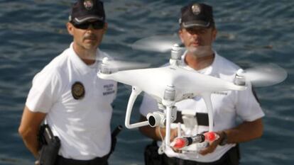 Un dron patrulla la bahía de Benidorm y el cercano parque natural de la Serra Gelada desde el pasado 1 de julio. Cuatro agentes de la Policía Local de esta turística localidad alicantina se encargan de pilotar esta aeronave no tripulada capaz de desplazarse a 70 kilómetros por hora y con una autonomía de vuelo cercana a la media hora. “Fuimos de los pioneros, pero desde entonces otros municipios españoles han incorporado drones en sus patrullas de vigilancia”, explica Carlos López, Intendente jefe del Servicio de Playas de la Policía Local del Ayuntamiento benidormí, que durante los meses de verano dobla o triplica su población con la llegada de miles de turistas.