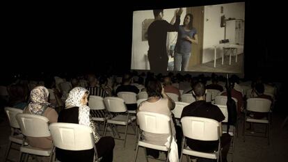 Y esa otra cara se vio en el rostro de muchos de los asistentes. Fátima, Sara y Latifa, de nueve, ocho y seis años, respectivamente, no habían visto nunca una película en pantalla gigante. El jueves se estrenaron con Cinema Paradiso. Y como Totò, alucinaron con la luz del proyector. Ana Isabel González, la codirectora del festival, recordaba poco antes del pase la cara también que había puesto Agustín Rodríguez, el cura de la parroquia de Santo Domingo de la Calzada, cuando escuchó la propuesta: “¡Cine en la Cañada!”. Su respuesta fue la de muchos también por lo insólito, acaso, del asunto. Pero lo cierto es que aquello no era nuevo. Desde 2011, la fundación Voces imparte aquí talleres audiovisuales con niños de 7 a 14 años. La idea inicial, de hecho, era hacer un festival con esos cortos hechos por los chavales. “Pero aquello fue creciendo y decidimos lanzarnos a hacer algo más grande”, explica emocionado el actor Carlos Olalla, el otro director de la muestra. “Todo el mundo hizo suya la idea”.
