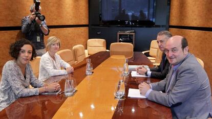 El partido liderado por Andoni Ortuzar y la coalición en la que se integra la formación morada han mantenido este viernes un encuentro dentro de la ronda de contactos con los distintos partidos que inició este pasado jueves el PNV para explorar la posibilidad de llegar a acuerdos para conseguir un Gobierno "estable y fuerte".