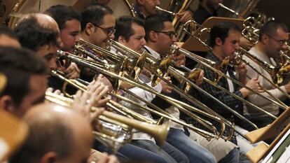 En los pasillos del Auditorio Nacional los músicos afinan, limpian y preparan instrumentos y partituras. "Y...un, dos, tres". La Banda Sinfónica Municipal arranca el ensayo en el Auditorio Nacional (Príncipe de Vergara, 146) para el concierto de la temporada de otoño que tienen esa misma tarde. Se trata de una agrupación formada por 72 músicos, aunque el repertorio está específicamente creado para 90 artistas, la totalidad de la plantilla. "Pedimos que se recuperen las plazas que faltan", reclama la comisión sindical del conjunto.