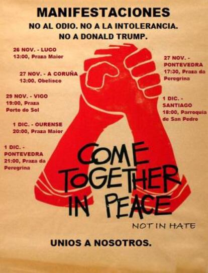 "La disidencia es la forma más elevada de patriotismo. Non chores, loita! No a Trump, no al Ku Klux Klan, no al fascismo en USA". El grupo que al caer la tarde se ha citado en la plaza de Cervantes para recorrer a voz en grito las calles de la zona vieja de Santiago no supera las 10 personas, pero sabe hacerse oír, parece un regimiento. La mayoría son profesores de su lengua en Compostela y hoy van cargados de carteles con proclamas en inglés y en gallego. Avanzan por el empedrado con un poderío vocal y un ritmo de gospel que atraen enseguida a algunos turistas curiosos, y unos y otros se lían a hacerles fotos como si fueran un Pórtico de la Gloria sin andamios. Ha nacido Galegos n’Americans against Trump and hatred (Gallegos y americanos contra Trump y el odio), una plataforma integrada de momento por poco más de un centenar de estadounidenses residentes en Galicia, buena parte docentes y auxiliares de conversación todavía muy jóvenes, que se definen como "un movimiento político".