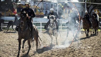 Para estar entrenados, dedican las mañanas a trabajar en la sede de la Casa de Campo, en las instalaciones de la Brigada Provincial de Seguridad Ciudadana. En una pista de tierra, jinetes y caballos pasan por arcos de fuego. En algunas ocasiones, el animal revoca, pero se continúa hasta que lo consigue. Otro ejercicio consiste en continuar la marcha mientras oyen disparos de fogueo de escopetas y carabinas. Eso sí, durante todo el entrenamiento tienen de fondo los cánticos de la hinchada del Real Madrid, emitidos por dos potentes altavoces.