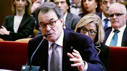 El expresidente de la Generalitat, Artur Mas, se ha enfrentado este lunes a un equilibrio delicado: el que debe mantener para evitar una condena por desobediencia y, al mismo tiempo, reivindicarse como líder político de la consulta independentista del 9 de noviembre de 2014. El Tribunal Constitucional había prohibido, cuatro días antes, la votación. Pero el Gobierno catalán la impulsó de todos modos, según la Fiscalía, que acusa a Mas de desobediencia y prevaricación. “No había ánimo de cometer ningún delito ni de desobedecer a nadie”, ha explicado el expresident, que en una breve intervención (45 minutos) ha evitado el interrogatorio del fiscal y se ha limitado a contestar a su abogado. Mas ha recordado que el Constitucional no advirtió de las consecuencias que podía tener seguir con la consulta. “Si tan evidente era que era un delito, ¿cómo puede ser que el Constitucional no hiciera nada para hacer cumplir su resolución?”, se preguntó. La vicepresidenta del gobierno de Artur Mas, Joana Ortega, y la exconsejera de Enseñanza, Irene Rigau, avalaron al presidente y afirmaron que no recibieron ningún requerimiento del Alto Tribunal.