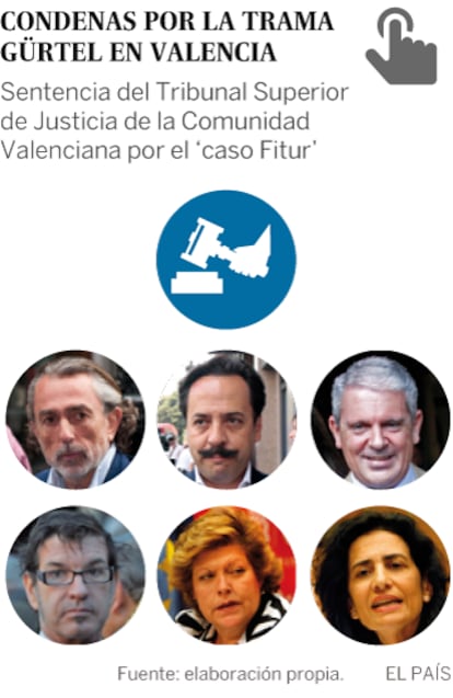 En total han sido condenados 11 de los 13 enjuiciados por delitos de malversación de caudales públicos, tráfico de influencias, cohecho, falsedad y asociación ilícita. La exconsejera de Turismo del PP en la etapa del expresidente Francisco Camps, Milagrosa Martínez, apodada La Perla, ha sido sentenciada a una pena de nueve años de prisión, y Rafael Betoret, ex jefe de gabinete de Turismo, ha sido condenado a seis años de cárcel. La también exconsejera Angélica Such, y Juan Bover, exjefe jurídico de la Agencia Valencia de Turismo, han sido absueltos.