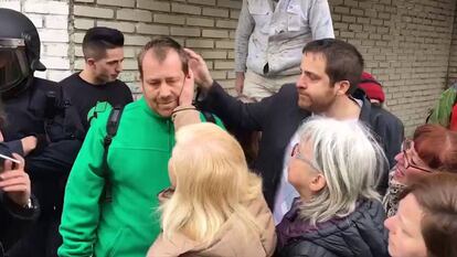 Alrededor de las 11.45 horas comenzaron a salir del portal 23 representantes de la PAH que fueron identificados por los agentes, con el brazo en alto y vitoreados por los vecinos. Tras ellos, finalmente salió Fátima, llorando. "Fátima estamos contigo", gritaban los activistas. Numerosos vecinos la arroparon, pero como muchos explicaban, "el verdadero problema estará cuando las niñas salgan del colegio y no tengan casa". A su vez, muchos de los presentes recriminaban a los agentes que la afectada se quedara en la calle con dos menores a su cargo y sin ninguna de sus pertenencias; todas quedaron dentro de la vivienda desalojada.