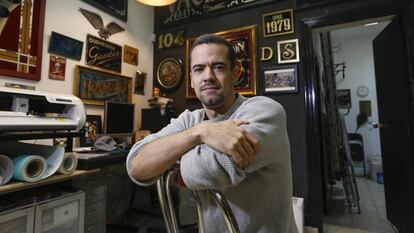 Su único competidor, colega y compañero de fatigas, es Tom Graham, 43 años, pelo largo y pintas de estrella de rock, que lleva más de dos décadas pintando rótulos. Llegó a Madrid hace 19 años desde Bournemouth (Inglaterra). Allí todavía se mantenía la tradición de cristales rotulados para decorar y anunciar los tradicionales pubs ingleses. Cuando aterrizó se puso a servir pintas y empezó a explotar su talento pintando el local en el que trabajaba. Fue entonces cuando abrió su primer taller en Malasaña. “El barrio es como una galería de arte para exponer mis obras”, cuenta Graham.
