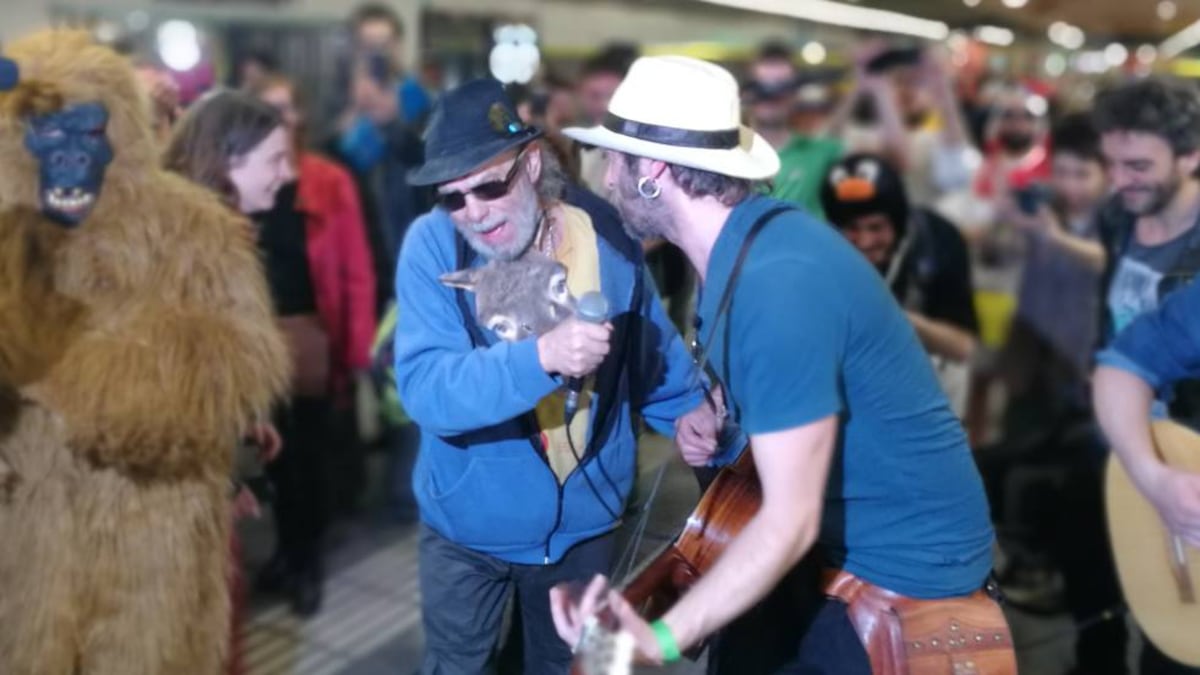 A las cinco de la tarde la estación de metro de Santa Coloma, donde se crió Jairo Perea (el cantante de la banda), se ha llenado de seguidores, familiares y amigos disfrazados. Janet Garzón, una seguidora "incondicional", ha acudido vestida de gorila a la cita. "Voy a perder dos kilos con este traje pero lo pasaremos muy bien", comentaba minutos antes de que el grupo llegara a la estación con guitarra, trompeta y dos altavoces. Silvia, Rosi, El Cuervo y Catalina, amigos de la infancia del cantante, han acudido disfrazados de conejos y con alguna que otra cerveza escondida en el bolso.