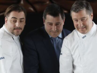 Los hermanos Roca han confesado hoy en Bilbao haber aprendido en Euskadi a cocinar el 'perretxiko' y el bacalao, un producto en el que la primera receta que crearon incluía asimismo el queso Idiazabal. La histórica sede del BBVA en Bilbao se ha transformado esta mañana en cocina, y las moquetas, tapices y acabados de madera de su planta noble se han fusionado de la mano de los hermanos Roca, del restaurante El Celler de Can Roca (Girona), con los fogones para aupar la excelencia y homenajear a la cocina vasca.