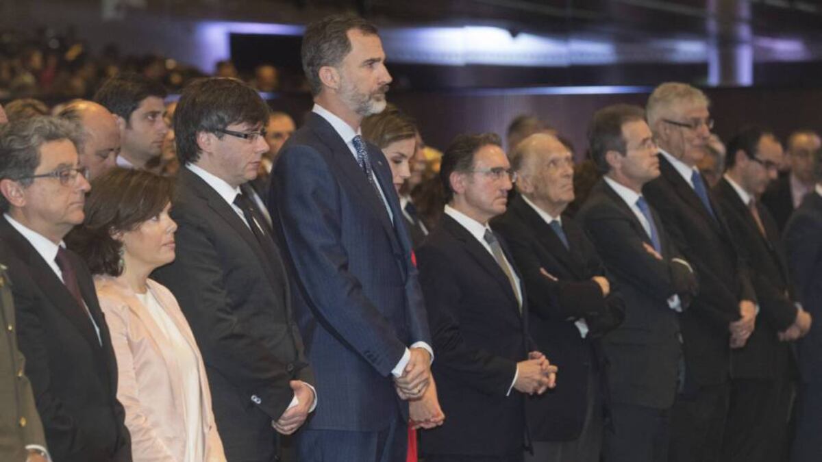 Al inicio del acto, en el que también estuvieron presentes la vicepresidenta del Gobierno, Soraya Sáenz de Santamaría y el presidente de la Generalitat, Carles Puigdemont, se ha guardado un minuto de silencio en homenaje a las víctimas del atentado perpetrado ayer en Manchester. “Hoy debía ser un día de celebración pero quiero comenzar mis palabras expresando mi solidaridad y afecto al pueblo británico”, ha apuntado el Rey.
