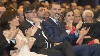 La vicepresidenta del Gobierno, Soraya Sáenz de Santamaría, ha advertido este martes que “la democracia tiene poder para evitar el referéndum”. Según dijo ayer en una conferencia en Madrid el presidente de la Generalitat, Carles Puigdemont, la votación se llevará a cabo sí o sí, a través de “un referéndum pactado” o de uno “homologado internacionalmente”, sin acuerdo. La vicepresidenta ha respondido al órdago lanzado por Puigdemont después de compartir precisamente un acto con el propio presidente de la Generalitat y los Reyes de España. “Las conferencias no son el escenario para el diálogo. El mejor escenario para el diálogo es el congreso”, ha indicado Sáenz de Santamaría.