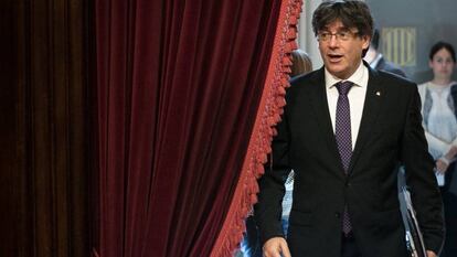 Preparado para iniciar la convocatoria de un referéndum unilateral, Carles Puigdemont ha dado este miércoles un giro en sus apelaciones a Mariano Rajoy. En sesión parlamentaria, y aprovechando una pregunta de su propio grupo, Junts pel Sí, el presidente catalán ha renunciado a pedir al Gobierno central que se abra a negociar una salida pactada al referéndum. Como si considerara esa petición una pantalla caducada, ha apelado al presidente del Ejecutivo central a explicar cómo pretende impedir la celebración de la consulta. Y si “está dispuesto a utilizar la fuerza”. Antes ha denunciado que “el debate político basado en la criminalización del adversario es el preludio del totalitarismo”