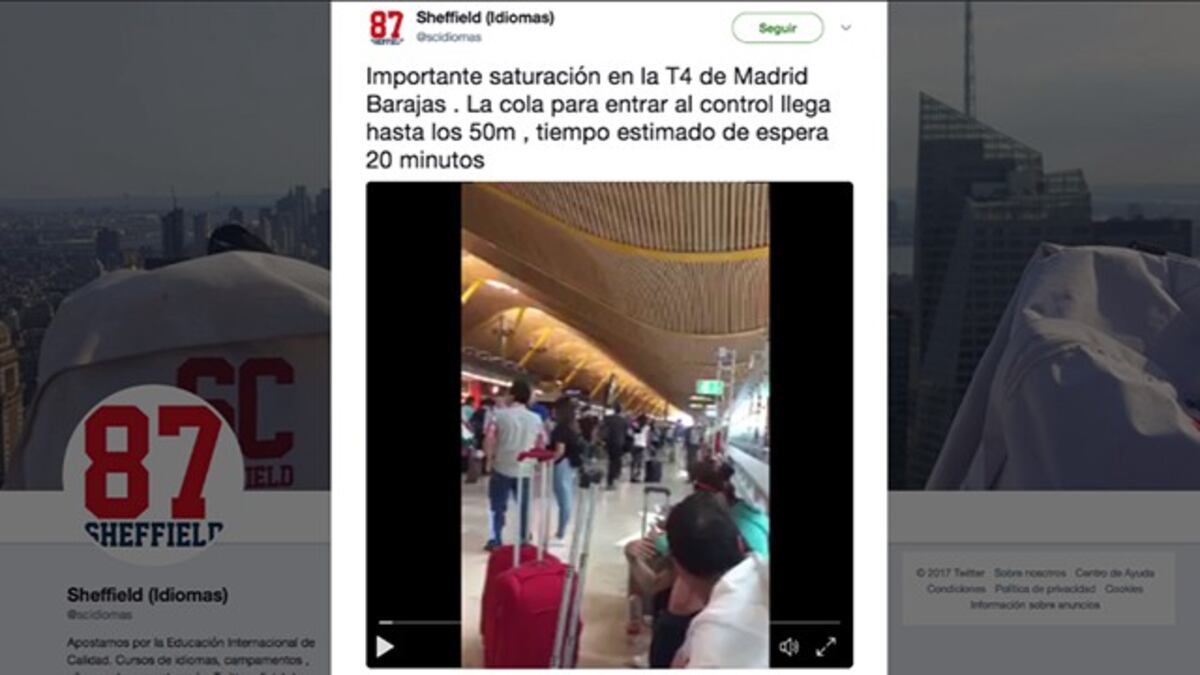 Fuentes aeroportuarias informan de la existencia de grandes colas este domingo en el Aeropuerto de Barajas, con esperas de entre 30 y 45 minutos a las 10.45 en el control de pasaportes de salida de la unidad Satélite (SAT) de la terminal T-4, que cuenta con 20 puestos de paso abiertos. Los viajeros también han soportado a la misma hora esperas de 25 minutos en el control de seguridad. Ha habido momentos de tensión debido a los nervios, pero finalmente todo se ha solucionado. La situación se podría repetir esta tarde a partir de las 17.00, cuando se espera una gran afluencia de viajeros que regresan a su lugar de origen después de participar en el World Pride.
