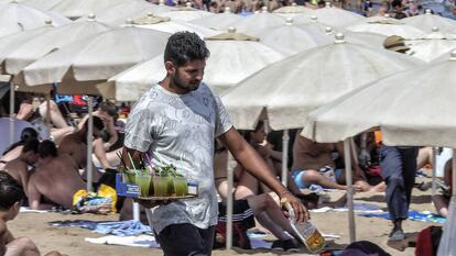Al mediodía, la playa de la Barceloneta está ya a rebosar. EL PAÍS acude allí y adquiere un mojito servido por un camarero ambulante que apoya la bandeja en la arena mientras con la otra mano se dispone a añadir más ron a la consumición y un vaso de sangría. “La policía está todo el rato persiguiéndonos. Si fuésemos ladrones no nos dirían nada pero como venimos a ganarnos la vida nos amargan”, se queja el mojitero.
