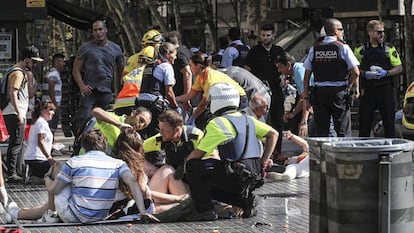 Efectivos de la Guardia Urbana y los Mossos d’Esquadra habilitan un primer cordón de seguridad en la zona. Los equipos sanitarios van llegando a la zona para socorrer a las víctimas, con la ayuda de voluntarios. El estado de pánico provoca al menos tres estampidas en una zona intensamente concurrida. Las calles y plazas del centro de Barcelona se vacían, pese a que grupos de personas se resguardan en establecimientos de la zona. Las estaciones de transporte público cercanas al suceso son desalojadas y se cierran hasta este viernes al mediodía.