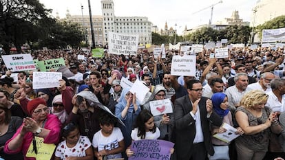 Las comunidades musulmanas de Barcelona se concentraron la tarde de este lunes en la plaza Catalunya para apoyar a las víctimas y condenar los actos terroristas que pretenden confundir a la opinión pública al vincular la extrema violencia con el Islam. Según la Guardia Urbana, más de 2.500 personas de diferentes colectivos se reunieron a las 19.00, muy cerca de La Rambla —donde se produjeron los atentados del jueves—, pidiendo enérgicamente la paz.