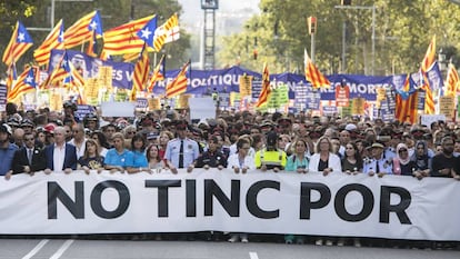 Los catalanes han salido este sábado a la calle en Barcelona para demostrar que no tienen miedo al terrorismo islámico. Decenas de miles de personas —medio millón, según la Guardia Urbana— han ocupado el paseo de Gracia para exhibir su rechazo a los crímenes de la semana pasada en La Rambla y en Cambrils. La convocatoria se ha visto enrarecida por los constantes pitidos y abucheos destinados al rey Felipe VI y al presidente del Gobierno, Mariano Rajoy. También destacó una significativa presencia de esteladas y pancartas que vinculaban al Gobierno y a la corona con la violencia en Oriente Próximo. Pese a ello, el presidente de la Generalitat, Carles Puigdemont, y la alcaldesa de Barcelona, Ada Colau, han resaltado la unidad que la ciudadanía demostró contra los terroristas.