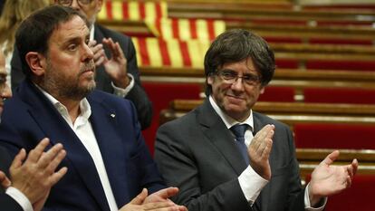 El independentismo catalán consumó este miércoles su desafío y el Parlament aprobó la ley que servirá para convocar el referéndum de independencia del 1 de octubre en medio de una bronca política sin precedentes. Poco después, el Gobierno catalán en pleno ha firmado el decreto de convocatoria de la consulta del próximo 1-O. Lee el texto íntegro de la ley aprobado por la Cámara catalana.