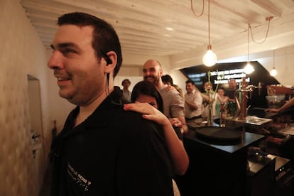 La cena se prolonga durante unas dos horas. La oscuridad fomenta la convivencia y hace levantar la voz a los clientes. "¿Pero esto qué es?". "No acierto ni uno". Todos palpan las elaboraciones. El vino también desconcierta. "Nueve de cada diez clientes confunden los vinos", aclara Fabregat, que sondea a los clientes sobre las elaboraciones mientras sirve, guía y agasaja. La idea de la marca es incorporar a personas discapacitadas en el mundo laboral. En Madrid tienen un convenio con la ONCE para reclutar a sordos o ciegos. En el local trabajan 17 profesionales entre los que figuran 10 camareros ciegos. "¿Qué mejor que un ciego para servir a oscuras?", exclama el dueño ."Se les contrata por sus habilidades, no por su discapacidad. Todavía no hemos encontrado a un cocinero ciego", señala el dueño.