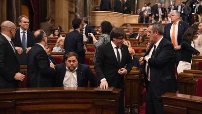 El presidente de la Generalitat, Carles Puigdemont, reunió ayer a varios de sus consejeros en el Palau de la Generalitat para consensuar la respuesta del Ejecutivo catalán al requerimiento del Gobierno, que le ha exigido que aclare si declaró o no la independencia el pasado martes. En el encuentro participaron también diputados de Junts pel Sí y de la CUP, los dos grupos que sustentan la mayoría independentista en el Parlament, y representantes de las entidades soberanistas ANC y Òmnium Cultural. Al menos acudieron al cónclave siete de los 13 consejeros del Govern: Josep Rull (Territorio); Lluís Puig (Cultura); Santi Vila (Empresa); Meritxell Borràs (Gobernación); Jordi Turull (Presidencia); Clara Ponsatí (Enseñanza) y Joaquim Forn (Interior).