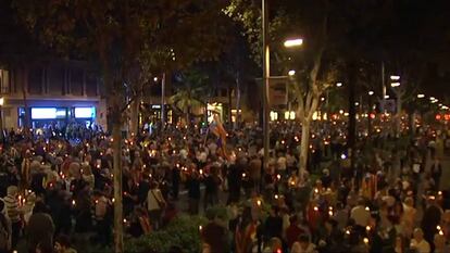 Miles de gargantas cantan "Els Segadors" con velas encendidas en el aire. Se escuchan proclamas como "Fuera la justícia española". pic.twitter.com/yMXOFW2dBx
