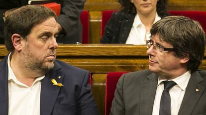 Por su parte, el vicepresidente de la Generalitat, Oriol Junqueras, ha pedido "responsabilidad, humildad y generosidad" a los ciudadanos de la "república" que hoy "desbordan alegría" y "confianza" a quienes tengan "alguna razón para inquietud o preocupación". "Actuamos de buena fe, con respeto y estima", ha dicho Junqueras en un discurso ofrecido en la escalinata de entrada al Parlament, rodeado de centenares de alcaldes y junto al presidente Puigdemont. Junqueras ha afirmado que a los independentistas les representan "valores de carácter universal", como son los de la igualdad, la libertad o la fraternidad, que comparten muchas personas en diversas partes del mundo, ha explicado.