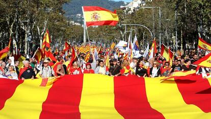 Cientos de miles de personas se han sumado este domingo en Barcelona a la manifestación convocada por Societat Civil Catalana, la principal organización ciudadana contra el independentismo. Todos somos Cataluña, rezaba el lema de su primera marcha tras la proclamación unilateral de la independencia y la aplicación del artículo 155. La multitudinaria protesta —1,3 millones de asistentes, según los organizadores, 300.000 según la Guardia Urbana— ha sido respaldada por cargos del Gobierno y políticos de los partidos constitucionalistas. Fue una llamada a la participación en los comicios del 21 de diciembre. "Votarem [Votaremos]", han gritado.