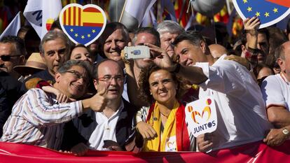 Miles de banderas de España, senyeras y, en menor medida, de la Unión Europea han ondeado por el centro de la capital, en los alrededores del Paseo de Gracia a mediodía. En la cabecera de la manifestación y tras la pancarta con el lema ¡Todos somos Cataluña! Por la convivencia, seny se ha posicionado una amplia representación de las fuerzas constitucionalistas. Allí ha estado el PP, con la ministra de Sanidad, Dolors Montserrat, el líder del PPC, Xavier García Albiol. También Ciudadanos, con su presidente, Albert Rivera, y la líder en Cataluña, Inés Arrimadas, así como el primer secretario del PSC, Miquel Iceta, junto a otros dirigentes socialistas. También han acudido a la cita el jefe de Gabinete de Rajoy, Jorge Moragas, y el exministro del Interior Jorge Fernández Díaz, además de Andrea Levy y Pablo Casado, del PP.