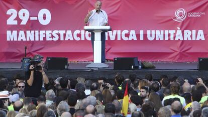 Paco Frutos, ex secretario general del Partido Comunista de España (PCE), ha vuelto este domingo a subirse a un escenario. Con efusividad, el exdiputado español se ha dirigido a los cientos de miles de personas que se han dado cita en las céntricas calles de Barcelona, en la manifestación convocada por Societat Civil Catalana. "Vengo a hablar en nombre de la izquierda no nacionalista. Suponiendo, permitidme la ironía, que existe la izquierda nacionalista", se ha arrancado el exparlamentario, que ha continuado: "Permitidme también que utilice el lenguaje del adversario. Yo soy un botifler (traidor) a las mentiras y a las historietas que os inventáis cada día desde 1714. Soy un traidor al racismo identitario que estáis creando".