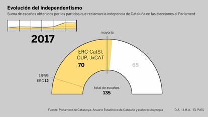 En 2010, además de ERC, aparece fugazmente otra formación independentista, Solidaritat Catalana, y, en 2012, las CUP, que logran tres escaños. En 2012, la antigua Convergència, ya abiertamente independentista, se presenta coaligada con ERC y otras fuerzas bajo la marca Junts pel Sí. Por primera vez, el conjunto de los diputados favorables a la separación de Cataluña de España supera la barrera de la mitad del hemiciclo, con 72 escaños. En las elecciones del pasado diciembre, la suma de esos dos grandes partidos, que concurrieron ya por separado, se redujo en dos diputados.