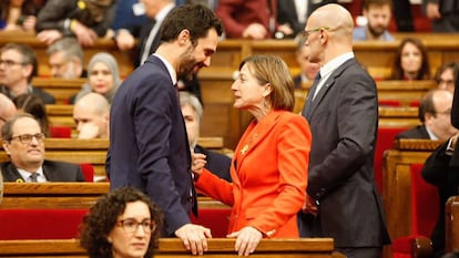 La nueva legislatura catalana ha superado este miércoles su primer acto. Los votos independentistas impusieron una Mesa del Parlament donde ellos son mayoría (cuatro de los siete puestos) y que presidirá Roger Torrent (ERC). El foco se desplaza ahora al debate de investidura del presidente de la Generalitat. Junts per Catalunya, la candidatura liderada por Carles Puigdemont, insistió en que solo este puede ser presidente, pese a estar fugado en Bruselas y a que el reglamento no permite la elección telemática. La investidura a distancia de Puigdemont abocaría a un nuevo choque con el Gobierno, que ya ha advertido de que la recurriría.