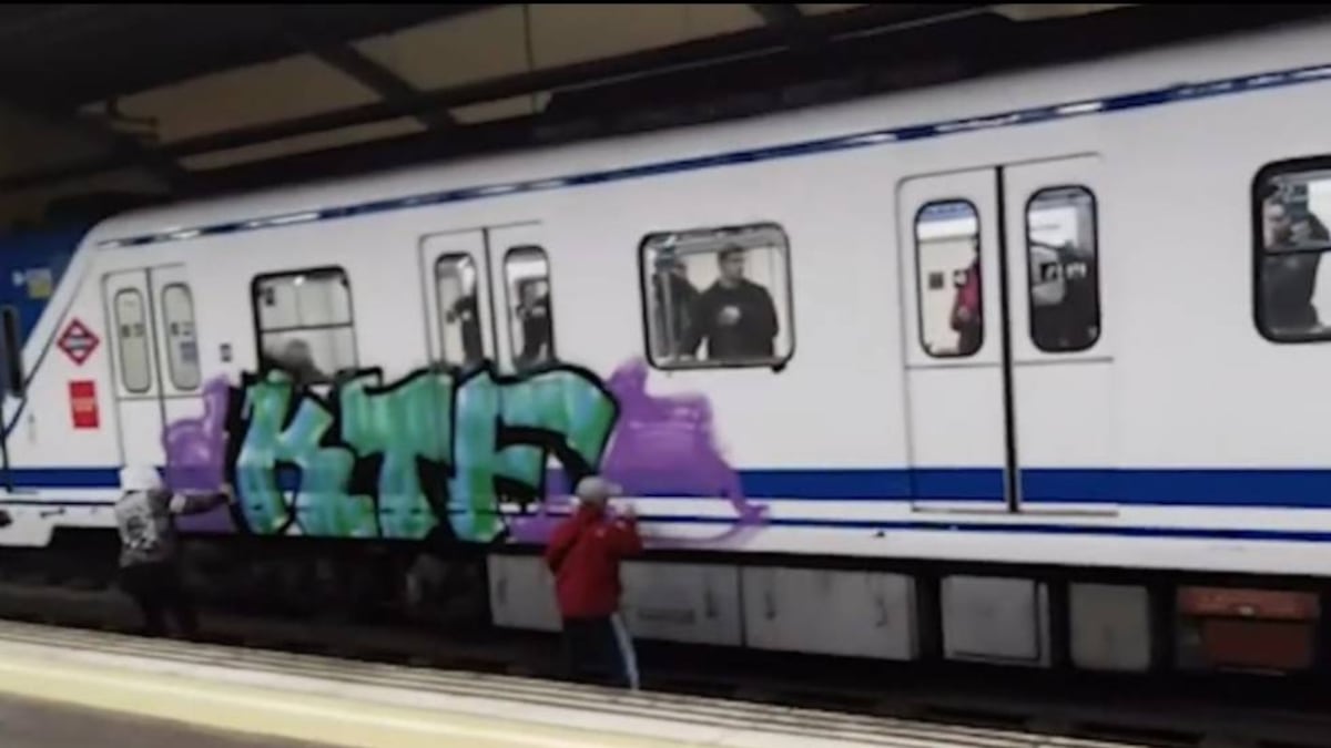 En el vídeo al que ha tenido acceso EL PAÍS se observa cómo dos individuos pintan desde las vías un grafiti en el exterior de un vagón ante a la atónita mirada de los viajeros. Metro Madrid explica que los grafiteros accionaron los frenos de emergencia del tren para poder bajar a las vías. En ese momento, un conductor de metro abre manualmente una de las puertas del vagón y rocía a los grafiteros con un extintor. "¡Caballero, que son chavales!", exclama el autor del vídeo al conductor. Los jóvenes suben al andén y huyen del lugar.
