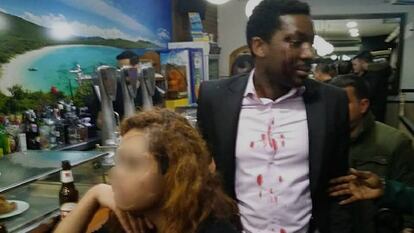 El intérprete africano Marius Makon fue golpeado el sábado con una botella en una cervecería por una mujer que lo llamó "negro de mierda"