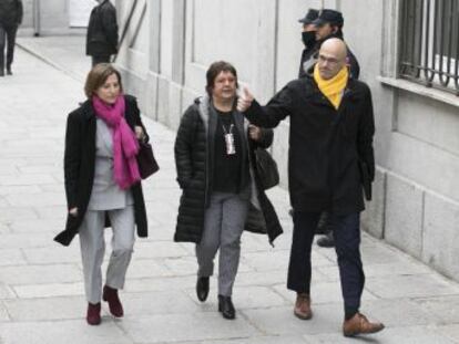 Visiblemente afectado por las detenciones y asegurando que Cataluña estaba viviendo sus “horas más oscuras”, Xavier Domènech, líder de Catalunya en Comú, admitió que no se daban hoy las condiciones para celebrar el pleno. Pero abogó por impulsar acciones “unitarias y transversales”. El diputado calificó la actuación del Supremo de “desproporcionada e intolerable”. Domènech pidió formar bloques transversales y diversos que unan “al conjunto de catalanes y demócratas”. No quiso concretar a qué se refería, pero anoche se apuntaba que quizá hoy pudieran organizar un acto de repulsa de todas las fuerzas soberanistas, entre las que están incluidas los comunes. “Vivimos el cierre de capítulos intensos de nuestra historia pero eso no puede ser derrota de un país”, añadió.