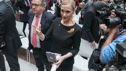 El acto ha coincido con la presentación del procedimiento de información reservada abierto por la Universidad Rey Juan Carlos en relación con el máster de Cifuentes, que ha dado a conocer la Conferencia de rectores (CRUE). Cifuentes ha hablado en su discurso de la importancia de los medios de comunicación, "un elemento esencial para trasladar a la sociedad la verdad". "La libertad es algo que no se nos regala", ha añadido la presidenta. Al concluir, ha salido del patio central de la Real Casa de Correos, sede del Gobierno regional, rodeado por una nube de cámaras y sin responder preguntas.
