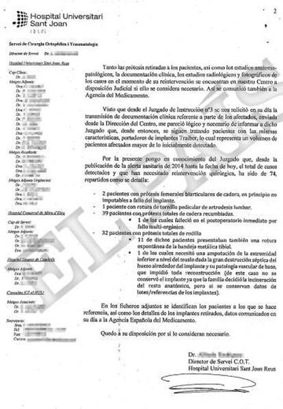 Estos son los dos casos más graves de la crisis de las prótesis de Traiber, que obligó a finales de 2014 a poner bajo vigilancia a 6.000 pacientes en España y a alertar a una decena de países a los que la empresa había exportado sus productos. El hospital más afectado es el de Reus, centro con el que Traiber había mantenido históricamente unas estrechas relaciones. Casi la mitad de los pacientes a los que les fue implantado material de Traiber en España fueron intervenidos en Reus. Un portavoz del hospital afirma que el informe "forma parte del seguimiento ordenado por el juzgado, con el que se está colaborando plenamente".