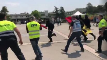 Según las imágenes gravadas por diferentes testimonios y colgadas en las redes sociales, varios jóvenes vestidos de negro que llevaban banderas rojas y amarillas se han intentado acercar a la parada, pero varios miembros del servicio de seguridad privada les ha cerrado el paso y ha impedido la acción de los encapuchados.