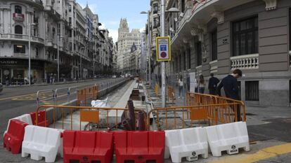 Un martillo neumático arranca el pavimento junto a Helados Italianos Palazzo, uno de las decenas de establecimientos que pueblan la Gran Vía de Madrid. En el interior del local, el ruido de la maquinaria se ha convertido en un fondo permanente. “Ahora que está la maquinaria aquí enfrente nos perjudica bastante, la gente no entra y yo salgo de trabajar con dolor de cabeza”, explica una de las dependientas de esta heladería. Como este, otros muchos locales aguantan las pérdidas de ingresos y las molestias de las obras de ampliación de las aceras a la espera de que los resultados merezcan la pena.