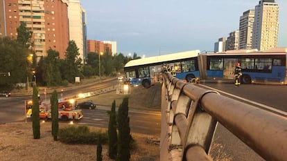 Un autobús de la EMT que cubría el Mad Cool queda colgando de un puente tras sufrir un accidente