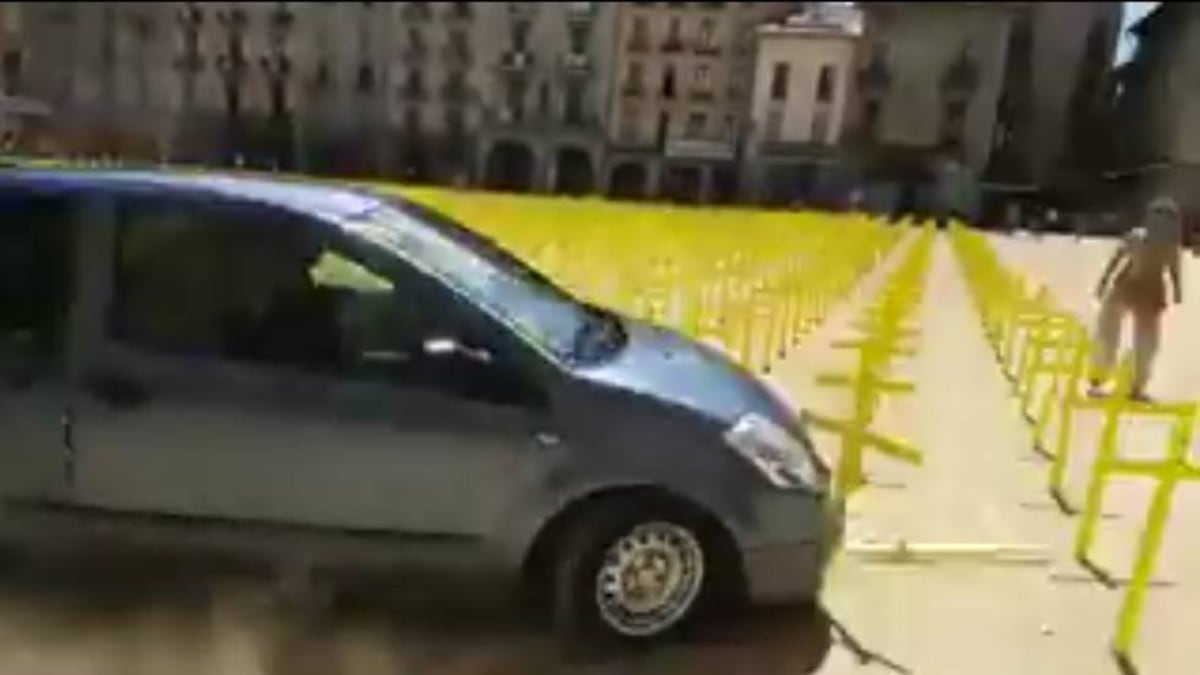 Un coche arrolla decenas de cruces amarillas colocadas en la plaza de Vic por los políticos presos