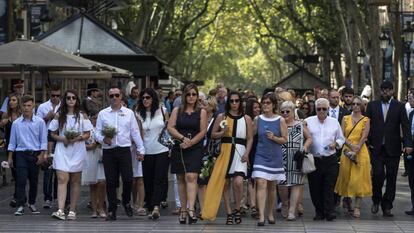 Quienes pueblan La Rambla, se unieron al homenaje este viernes. “Lo politizan todo y no está bien. Las víctimas que murieron no merecen esto”, lamentaba Mari Creu Aparicio, florista de la avenida barcelonesa. “Si el Rey quiere venir, que venga. Cada cosa tiene su lugar y hoy no era el momento de esto”, decía. En cambio, Sílvia Espinosa, que vende cupones en una cabina de la ONCE, situada a escasos metros del mosaico de Joan Miró, opinaba lo contrario. “Ya era hora de que le hiciesen un homenaje, pero el Rey no tendría que estar aquí. El Estado sabía que esto iba a pasar”, sentencia.