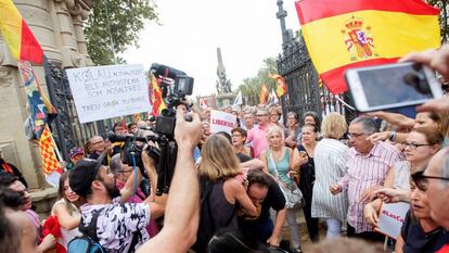 Ciudadanos ha convocado este miércoles en el parque de la Ciutadella, en Barcelona, una concentración para condenar la violencia y apoyar a la mujer agredida por retirar lazos amarillos (el símbolo independentista que solicita la liberación de los líderes políticos encarcelados por el procés) el pasado día 25, en medio de la escalada de tensión por la ocupación del espacio público con reivindicaciones independentistas. Un cámara de Telemadrid ha sido agredido en el acto. El presunto agresor ha sido detenido apenas 24 horas después de que la victima denunciara el martes los hechos ante la Policía Nacional. La agresión ocurrió el pasado sábado a mediodía frente al parque de la Ciutadella y las versiones sobre lo acontecido son diametralmente opuestas. Según la mujer, el hombre le pegó un puñetazo en la nariz porque estaba retirando lazos amarillos. El hombre, que presentó una denuncia contra ella ante los Mossos, sostiene que no actuó por motivaciones políticas, sino que le recriminó que, al tirar los lazos al suelo, estaba ensuciando la ciudad. El juez ha dictado una orden de alejamiento contra el presunto agresor.