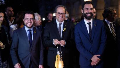 “Ya lo sabéis, nuestro Govern se ha comprometido a hacer efectiva la república (...). Lo haremos por todos los presos políticos y exiliados y por todos los que son perseguidos por haber dado la voz al pueblo”, dijo Torra en un mensaje estructurado como un paralelismo entre la actual situación política y la que vivieron las autoridades catalanas en plena Guerra de Sucesión en 1714. “Como hace 300 años, estamos en una nueva encrucijada histórica donde tendremos que decidir si ante la injusticia, las amenazas, el miedo, la violencia, las prisiones y el exilio nos conformamos o resistimos y avanzamos”.