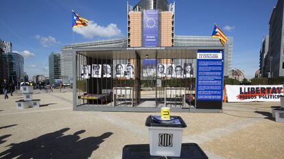 Las organizaciones independentistas Asamblea Nacional Catalana y Òmnium Cultural realizaron este martes una performance junto a las instituciones comunitarias para recordar a los políticos encarcelados. Un camión llevó desde Vic hasta Bruselas una prisión simulada en un trayecto de 18 horas por carretera —inicialmente escoltada por 40 motoristas— hasta la capital belga. La instalación, sobre la que se colocaron las fotografías de los políticos presos, ya estuvo activa en Vic, donde incluso invitaban al público a encerrarse en su interior. En este caso permaneció cerrada, y Puigdemont, que evitó en todo momento fotografiarse delante de ella, tomó la palabra a su lado. "Si Europa no quiere venir a las prisiones, nosotros las traeremos a Europa", afirmó en una crítica a los organismos comunitarios. Medio centenar de simpatizantes independentistas acudieron al acto, al que también asistieron un pequeño grupo de eurodiputados, el rapero huido de España Valtònyc, o el joven de los denominados Comités de Defensa de la República Adrià Carrasco, también fugado de España. El homenaje a los presos terminó con el canto de Els Segadors.