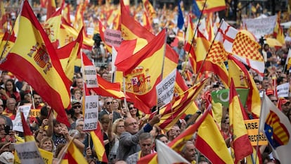 Miles de personas han participado la mañana de este viernes en Barcelona en la manifestación en favor de la unidad de España. La marcha, convocada por la entidad Espanya i Catalans, ha copado buena parte del Paseo de Gràcia y ha culminado en un acto en la plaza de Cataluña. Javier Megino, vicepresidente de ese colectivo, ha pedido a los jueces que instruyen la causa del procés que no se achanten cuando elaboren la sentencia e impongan severas penas de prisión a los políticos independentistas. "Ni olvido ni perdón. ¡Largos años de prisión!", ha exclamado mientras los concentrados pedían cárcel para el expresident Carles Puigdemont. Los convocantes, a mitad del acto, han estimado la asistencia en 300.000 personas. La Guardia Urbana ha reducido la cifra a 65.000.
