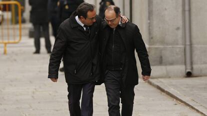 En declaraciones en los pasillos del Parlament, donde se celebra este jueves la sesión plenaria, los dos portavoces han coincidido en acusar al Gobierno de Pedro Sánchez de caer en una contradicción cuando defiende la separación de poderes y que, por tanto, no puede dar instrucciones a la fiscalía para que retire las acusaciones. A su juicio, la vicepresidenta Carmen Calvo se ha adelantado cuando ha dicho, antes de conocerse que se señalaba juicio oral, que las acusaciones de la Abogacía del Estado se conocerían en torno al día 2. "Estas coincidencias no avalan la separación de poderes", ha abundado Pujol, que ha lamentado que vaya a conocerse la petición fiscal justo en el primer aniversario de que los consejeros entraran en la cárcel.