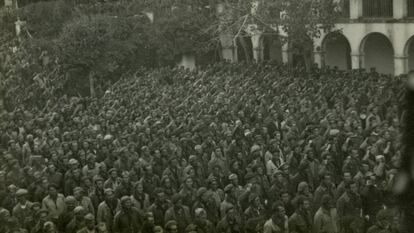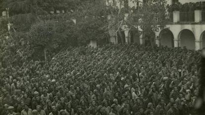 Parapetados tras sus boinas y sus cazadoras con cuello de franela, no hay prácticamente ni uno que sonría. Y eso que, en principio, dejaban la guerra y se iban a casa. Es una imagen del 25 de octubre de 1938 tomada en Les Masies, antiguo balneario entre el monasterio de Poblet y Espluga de Francolí, del homenaje que el Ejército del Ebro brinda a los miembros de las Brigadas Internacionales que, en número de 35.000 a 40.000 y de más de medio centenar de nacionalidades, participaron altruistamente (unos 10.000 no pudieron dar más: lo pagaron con su vida) en la Guerra Civil española. Hacía apenas cinco semanas, el 18 de septiembre, que la Sociedad de Naciones había adoptado una resolución por la que se ordenaba su retirada… Tampoco hay sonrisas abiertas en las jóvenes que portan flores para lanzárselas a esos brigadistas tres días después, el 28 de octubre, en el desfile que unos miles de ellos, representantes de todas las unidades y países, realizaron por la Avenida 14 de abril, la actual Diagonal. La tristeza más contenida es la de una de esas jóvenes, la de más a la izquierda, seguramente pensado en lo que esa marcha comportaría para el futuro de la niña con un lazo en la cabeza que lleva en brazos.
