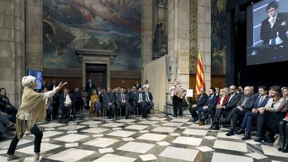 La imagen era impactante: una pantalla gigante proyectaba el pasado martes la figura del expresidente catalán Carles Puigdemont desde su refugio en Waterloo, observando con seriedad la reverencia que le dedicaba la bailarina Maria Teresa Agustí. Era uno de los pasos del Ball d'homenatge (baile de homenaje), interpretado durante el acto de presentación del Consejo por la República, en el palacio de la Generalitat.