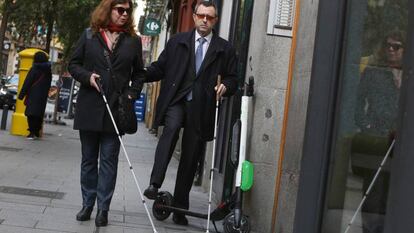 Luis Miguel López, de traje, corbata y gafas oscuras, camina en hora punta por Cibeles. El bastón con el que guía sus pasos de ciego no detecta ese extraño artefacto que prolifera por toda la ciudad: el patinete eléctrico.